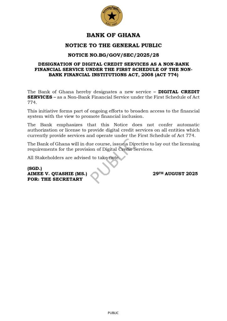 The Bank of Ghana has designated a new Digital Credit Service as a Non-Bank Financial Service under the First Schedule of the Non-Bank Financial Institutions Act, 2008 (Act 774).