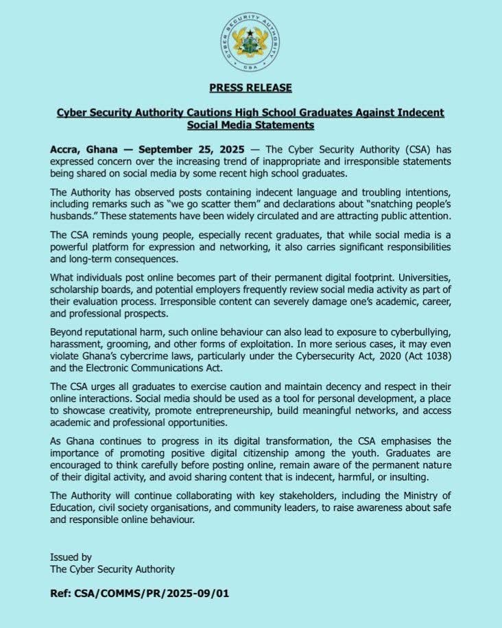 The Cyber Security Authority (CSA) has cautioned recent high school graduates to desist from sharing indecent and irresponsible content on social media.