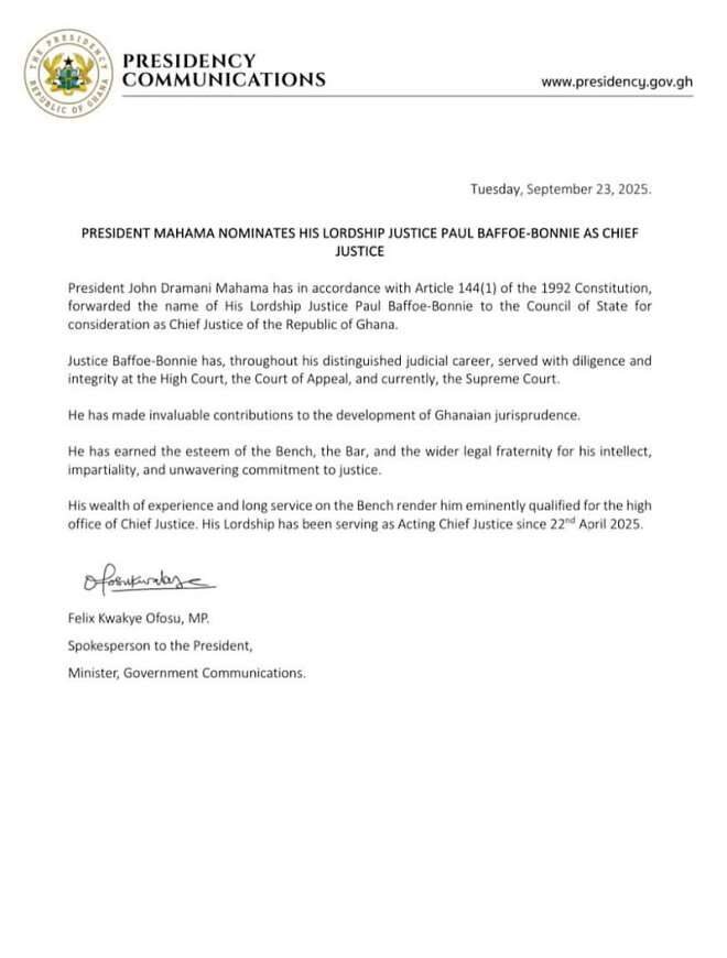 President John Dramani Mahama has nominated Supreme Court Justice Paul Baffoe-Bonnie as Ghana’s next Chief Justice, following the removal of Justice Gertrude Torkornoo earlier this month.